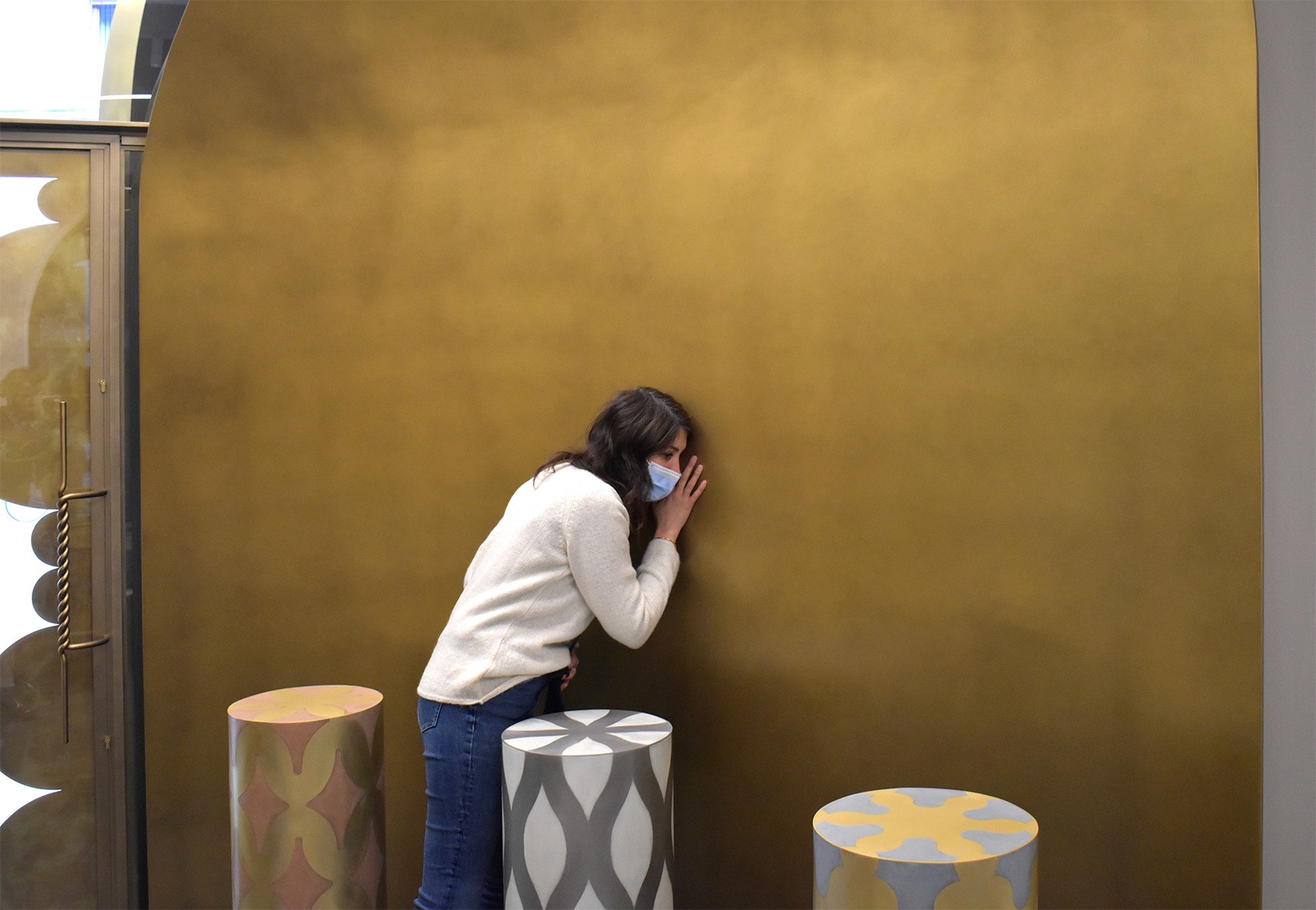 Two large dome-like surfaces at the showroom entrance are augmented through the use of transducers that transform the metal surface into a seamless sound emitters that engage users with a tactile interaction. By getting closer to the surface, visitors can experience the metal vibration and hear the sound of the De Castelli machinery at work blended with a music soundtrack to offer an alternative experience of the fascinating material production and factory operations.