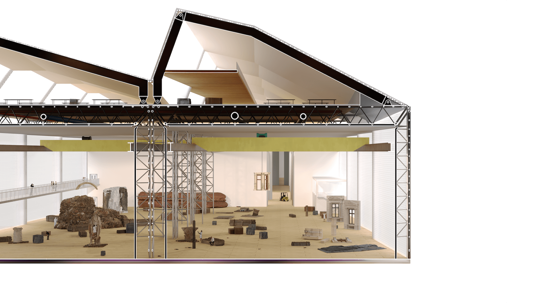 At Magnifica Fabbrica, everyone becomes a spectator of a show that is always in progress, participatory and dynamic, where the protagonists are not the actors who typically go on stage but the scenic artifacts and the women and men who are the creators of these works. From an architectural point of view, this opening is interpreted by metaphorically translating the Scenic Tower of La Scala from the theater to the Magnifica Fabbrica and transforming it into a transparent and permeable building.